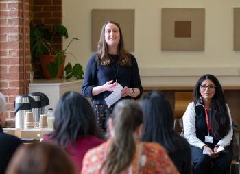 Dr Laura Blackburn speaking at the opening of the exhibition. Co-curator Dr Elizabeth Rendon-Morales is seated on her right.